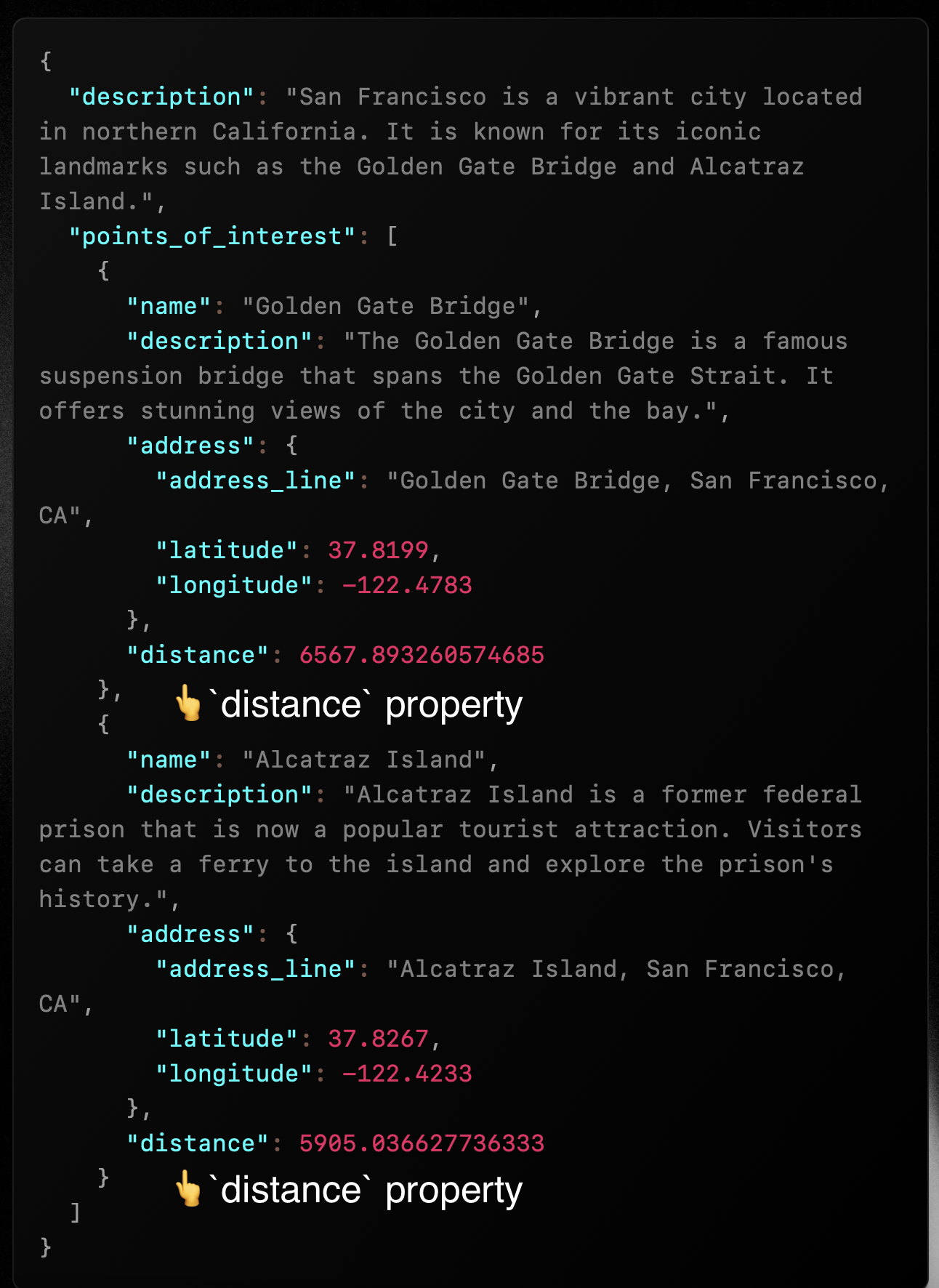 We now want to return the distance from the user to the point of interest — something like: “Golden Gate Bridge is 12km away from you”. For that we have: