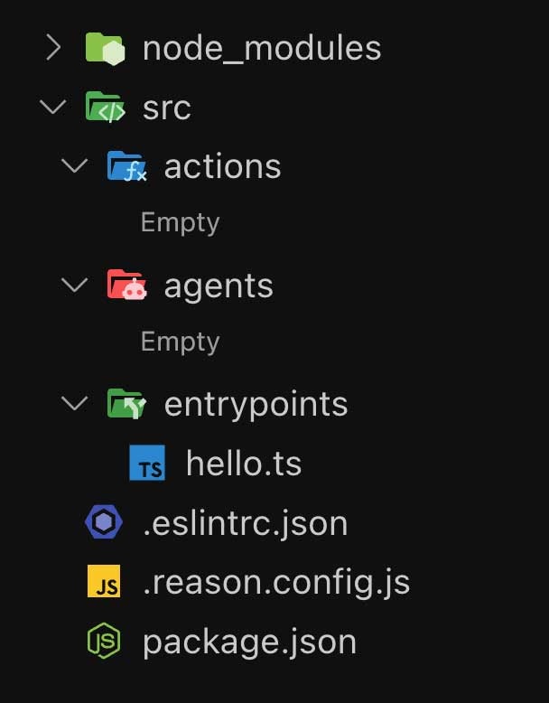 Let’s understand how a RΞASON project is structured:src/entrypoints: Is where all your (routes) are defined. We’ll talk more about entrypoints below.src/entrypoints/hello.ts: An accessible entrypoint (route/endpoint) at http://localhost:1704/hello..eslintrc.json: ESLint configuration file used to configure the RΞASON ESLint plugin..reason.config.js: Configuration file for RΞASON, to set your OpenAI Key and default model, amongst other things.src/actions: Is where all your actions are defined. We talk more about actions here.src/agents: Is where all your agents are defined. We talk more about agents here.