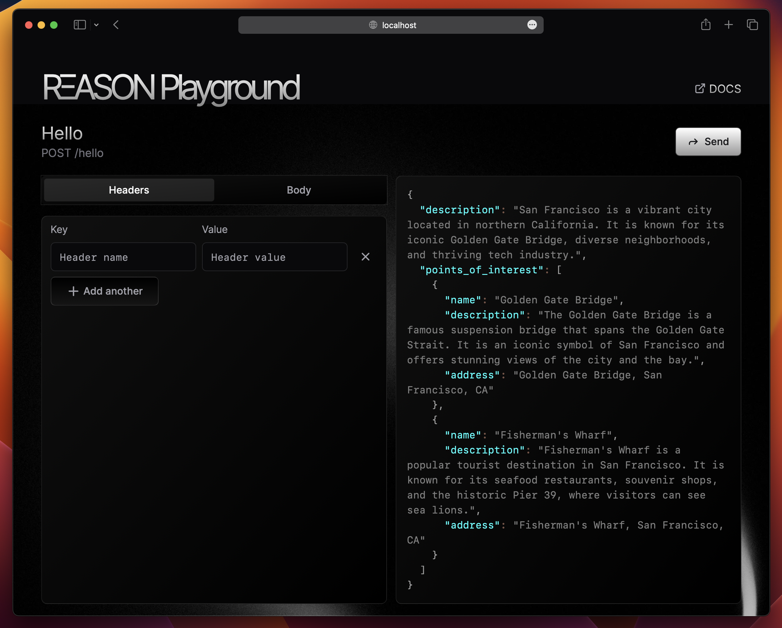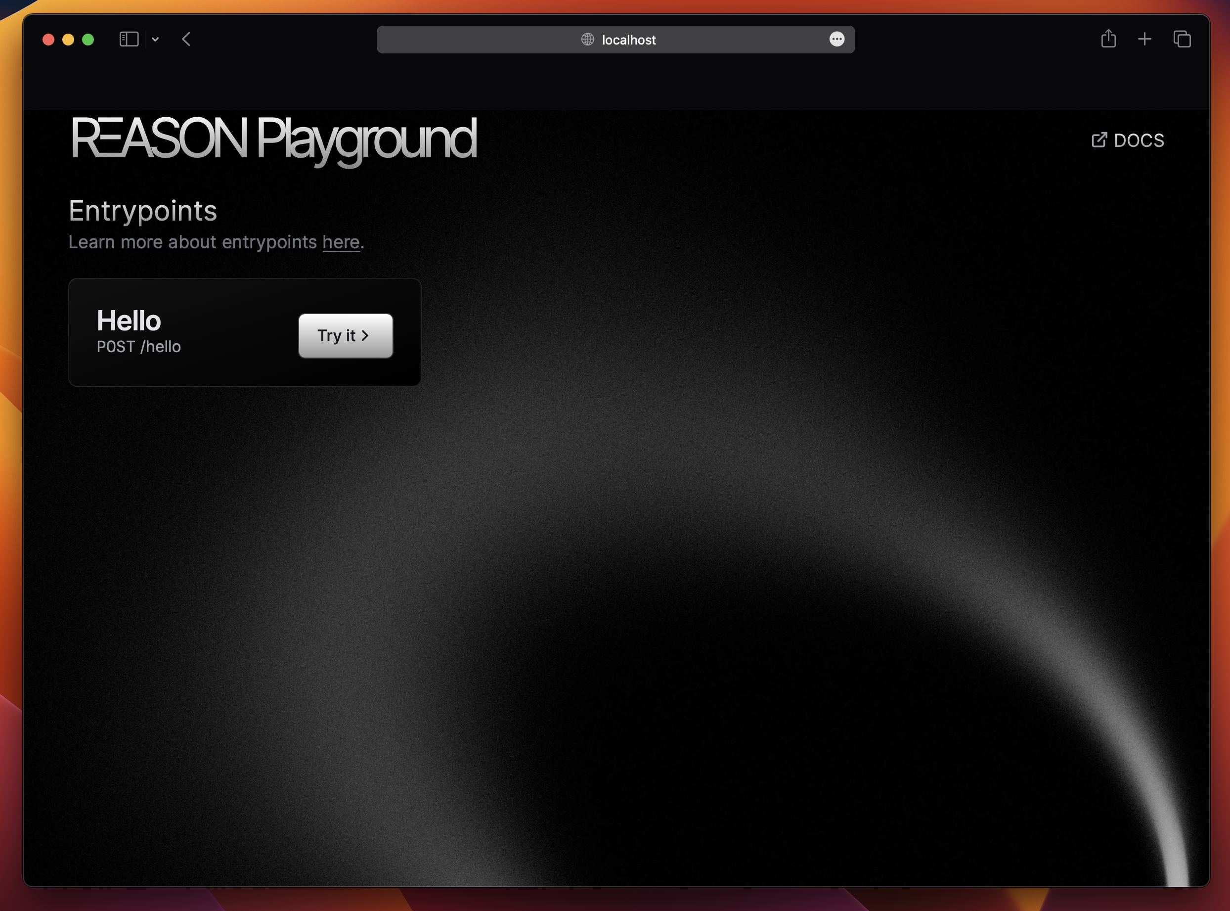 The RΞASON Playground is a web tool for testing your entrypoints. You can make requests and see their outputs. With the RΞASON Playground open, navigate to thehello entrypoint and send a request. You will see something like: