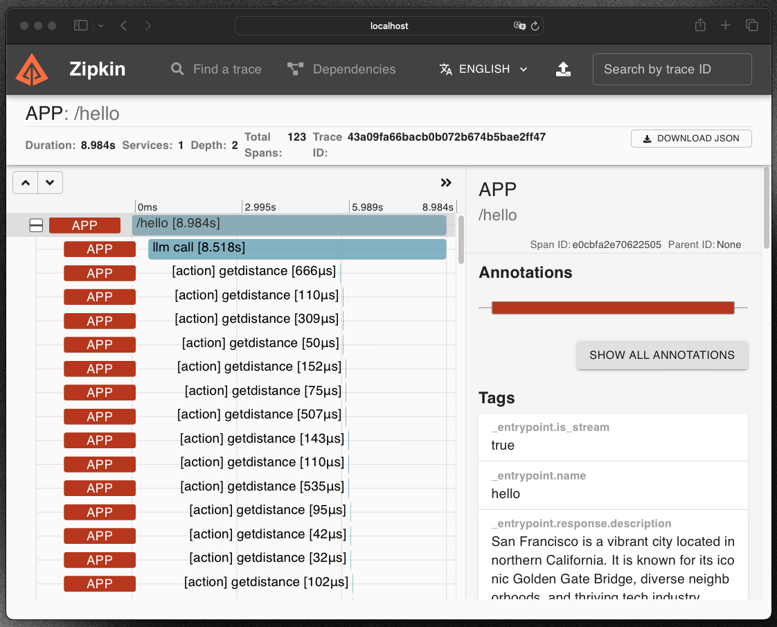 POST /hello — it is an icicle graph.It shows the time each took during your entrypoint execution. It also shows the inputs & outputs.Why is there many getDistance()?